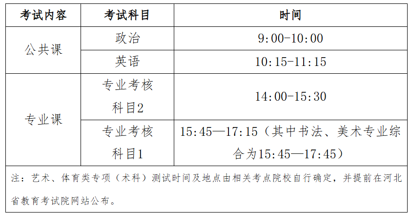 按照《河北省教育厅关于优化调整河北省普通专升本考试科类及科目设置的通知》(冀教学〔2023〕19号)要求,普通专升本考试科目设公共文化考试和专业综合(职业适应性)考核(简称“专业综合考核”,下同)两部分,总分500分。公共文化考试包含政治、英语2个科目,每科目满分100分。专业综合考核包含专业考核科目1和专业考核科目2(详见上述通知附件2),每科目满分150分。各类考生具体考试科目如下(‘√’表示需要参加考试,‘—’表示免试):