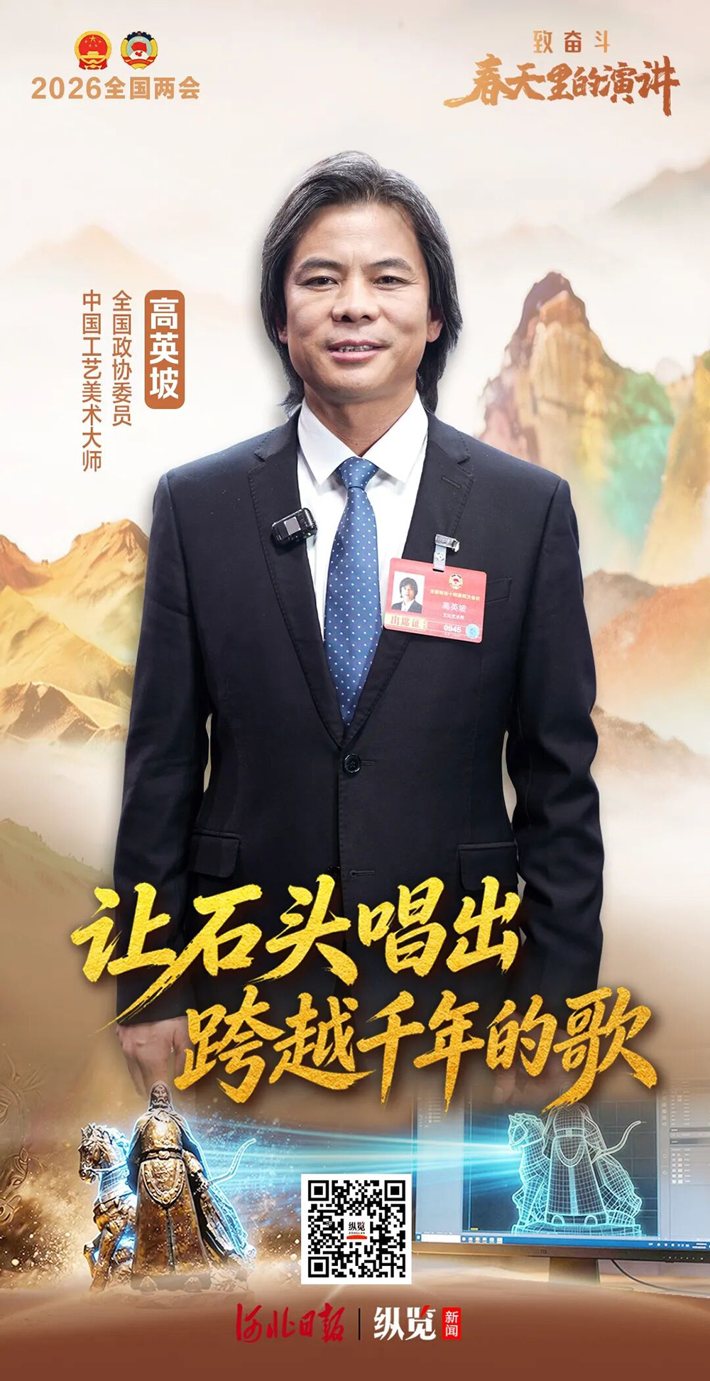 在全国两会召开之际,河北日报纵览新闻推出《致奋斗·春天里的演讲》创意AI系列视频。全国政协委员、我院教师、中国工艺美术大师高英坡受邀参与录制,分享其履行职责、参政议政背后的家国情怀,展现非遗传承与工艺美术教育的使命担当。