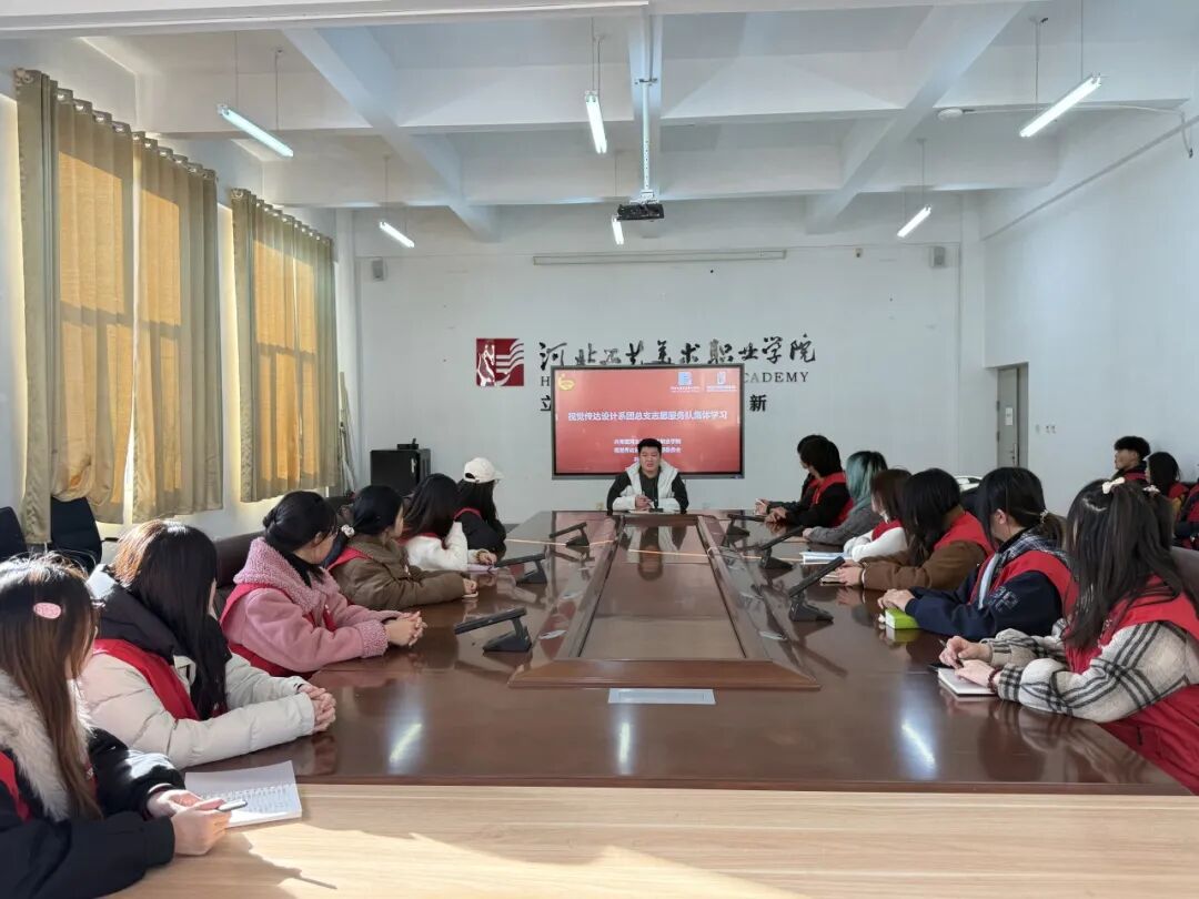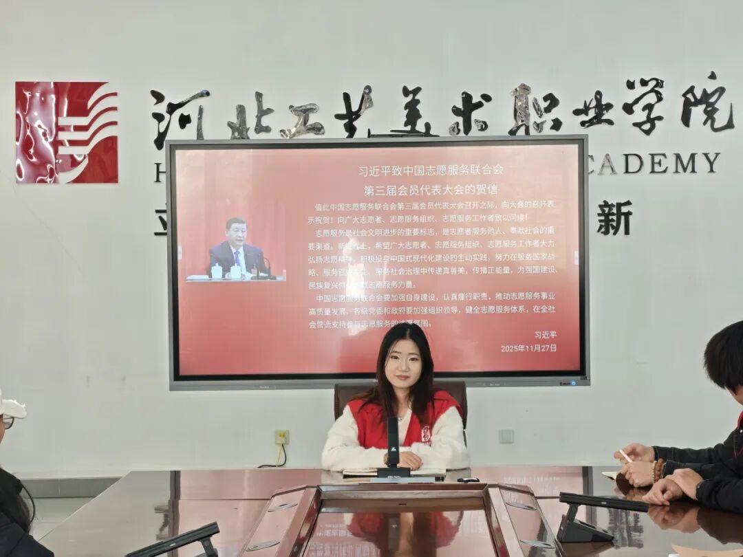 在2025年国际志愿者日来临之际,2025年12月3日,河北工艺美术职业学院视觉传达设计系志愿服务队开展专题学习活动,深入领会习近平总书记致中国志愿服务联合会第三届会员代表大会的贺信精神,凝聚“奉献、友爱、互助、进步”的青春力量,让志愿精神在设计青年心中扎根生长。视觉传达设计系团总支负责人赵骄阳出席学习。系团总支志愿服务部全体成员、系志愿服务队各品牌负责人及志愿者代表参加学习。