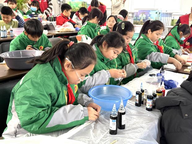 本次活动由支部教师张雅迪、张彭云、杨彤旭带领学生志愿者共同组织,面向实验小学五年级学生,通过讲解、示范与实践相结合的方式,带领孩子们领略扎染技艺的千年魅力,体验手工创作的乐趣。