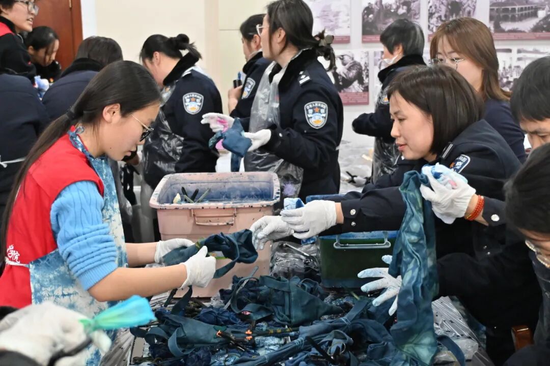 大家围坐一起,动手体验、交流创作,在色彩晕染间创作独一无二的作品,现场气氛温馨热烈。一扎一染,既是传统技艺的传承,也是匠心与温情的交融。通过非遗文化交流与暖心志愿服务,既丰富了女警官们的精神文化生活,也展现了我系青年学子服务社会、奉献爱心的责任与担当,让雷锋精神在艺术实践中焕发新的时代光彩。