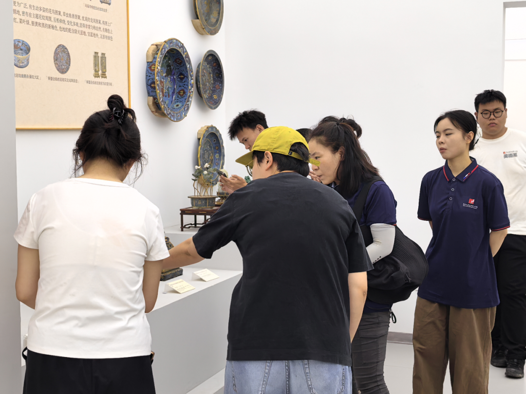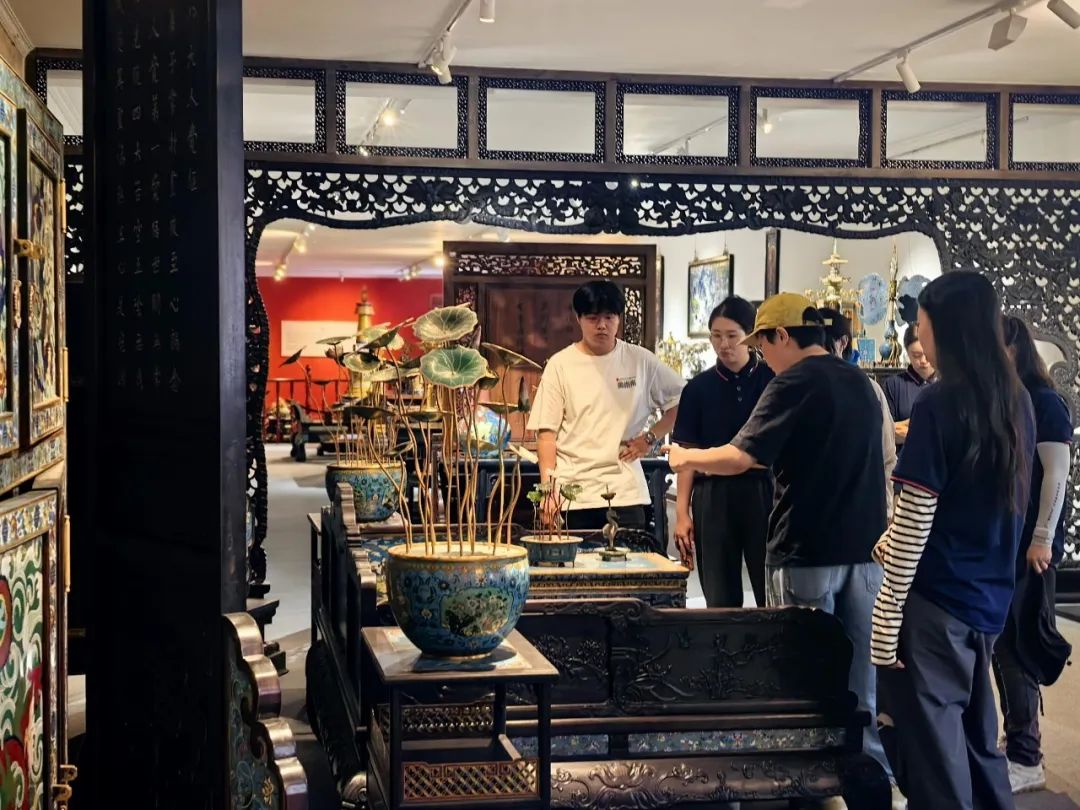 在掐丝珐琅艺术博物馆,队员们依次观摩了掐丝造型、点蓝上色、焙烧成型等多个工艺流程,沉浸式感受国家级非遗项目的艺术魅力。通过讲解员的介绍,大家了解到掐丝珐琅从宫廷御用走向当代生活的演变过程,切实体会到传统工艺在现代审美与文化消费中的活化与再生。