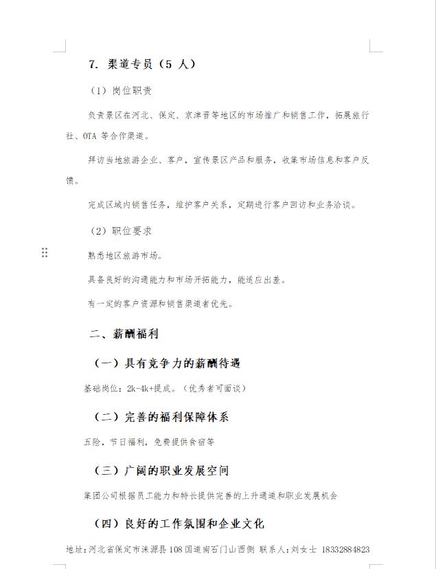 涞源县宏伟置业房地产开发有限公司涞源湖热带海洋世界数字科技分公司,是涞源县宏伟集团投资4.7亿,历时三年建造而成,总建设面积3万平米,日接待量可达8000人次,四季恒温运营模式,填补北方冬季亲水文旅空白,实现“全年无休,全龄畅玩”,以AR数字为核心打造的沉浸式热带海洋世界,实现4大数字科技应用。此外还有涞源湖旅游度假区,公司还有房地产、酒店、餐饮等业态,营销策划部正在招聘平面设计、文案、摄影、剪辑、主播、渠道专员等岗位。