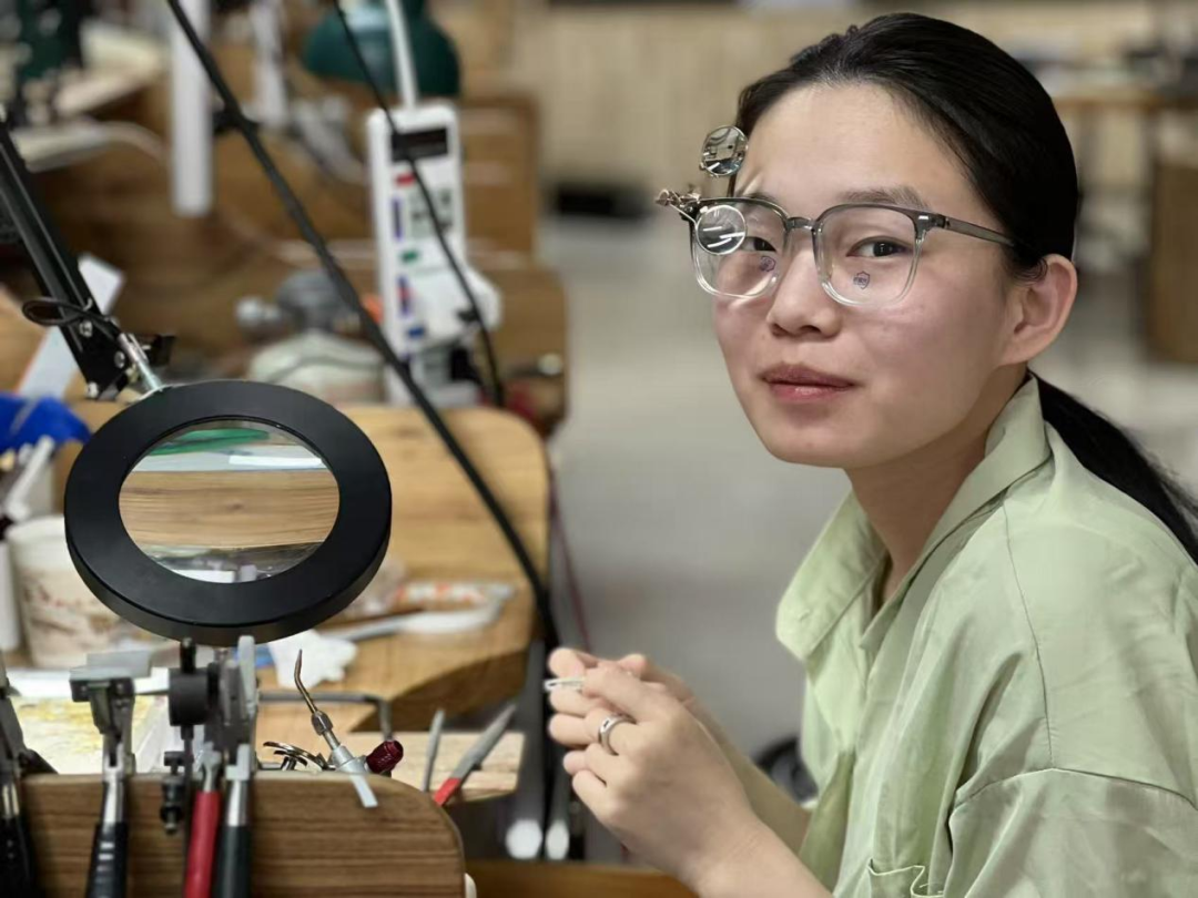 从初入校园的“技能小白”到闪耀赛场的“工匠新星”,她用汗水浇灌梦想,以实干笃定前行。石若霏的技能之路始于2023年考入河北工艺美术职业学院,就读于首饰设计与工艺专业的她首次了解到首饰制作工艺,如“花丝镶嵌”、“错金银”等,便被其齐巧深深吸引,她说:“当看到自己制作的珠宝作品精准成型,或是自己设计制作的作品售出时,那种成就感无以言表、无可替代。