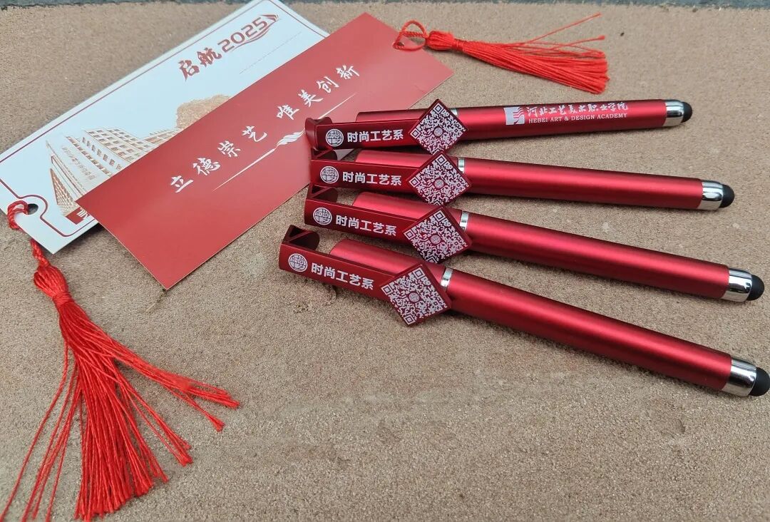 今年,时尚工艺系为2025级新生特别准备了专属迎新礼物:红色签字笔。笔身后端为触控设计,印有“时尚工艺系”Logo,实用且富有纪念意义。这份礼物寄托了对新生们书写青春、记录成长的美好期许。同时发放的还有校训书签,正面绘有河北工艺美术职业学院竞秀校区图案,背面印有“立德崇艺,唯美创新”的校训,传递学院对每一位新生的艺术启迪与严格要求。