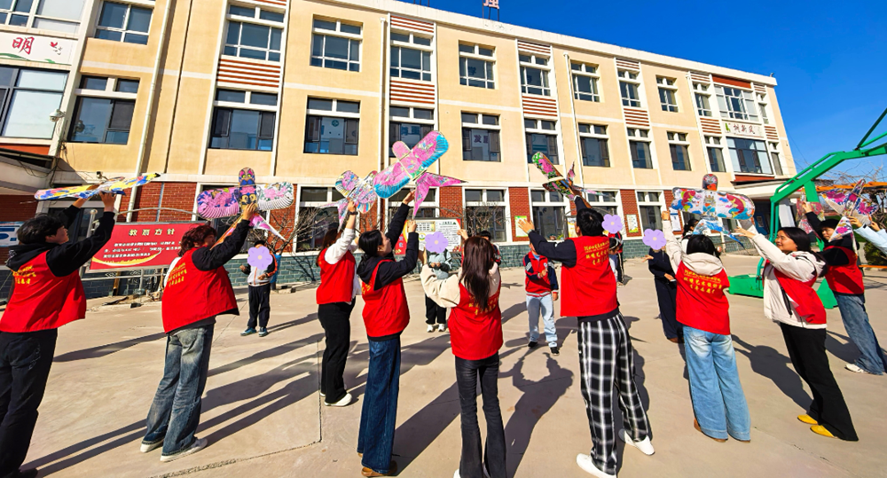 手绘纸鸢完成后,志愿者与孩子们一同来到校园空地,开启放风筝的欢乐时光。志愿者手把手协助孩子们放线、奔跑,一只只五彩斑斓的纸鸢迎着春风扶摇而上。此刻,春风托起的不仅是缤纷的纸鸢,更承载着孩子们纯粹的快乐与满满的自信。